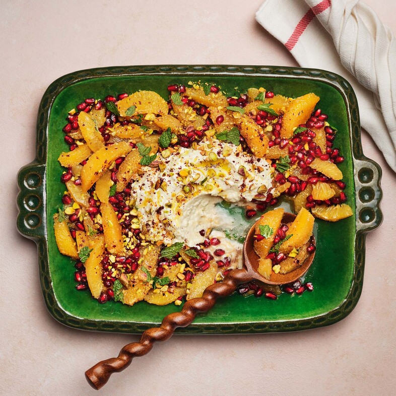 Appelsinsalat med pisket fetaost, granateplesirup og sumak