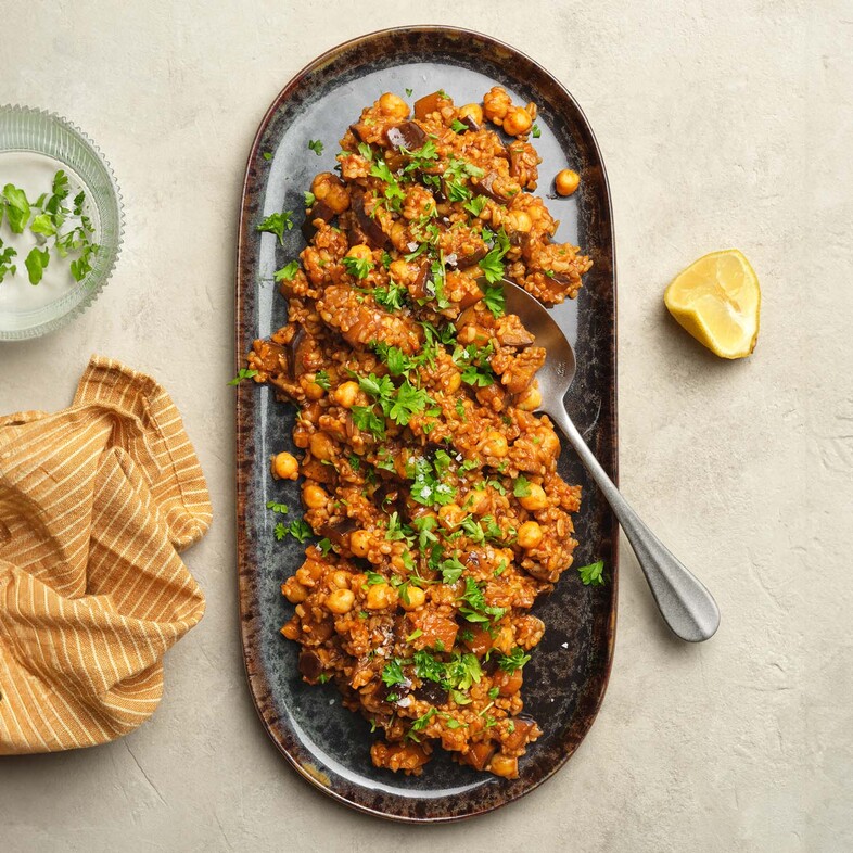 Pilaf er en klassisk rett fra Midtøsten og kan tilberedes på mange måter. Her tilbyr vi en variant med vår grove bulgur sammen med kikerter, aubergine og herlige krydder. Bytt gjerne ut den vanlige tomatpuréen med vår paprikapuré.