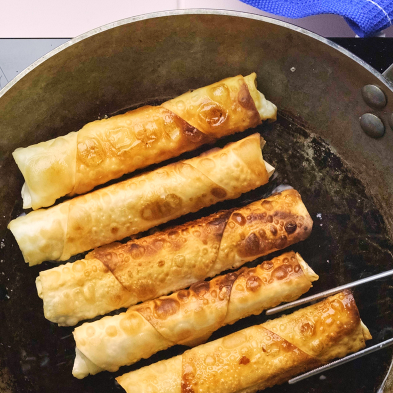 5. Varm opp en stekepanne med rapsolje slik at oljen dekker bunnen med ca. 1/2 cm. Frityrstek rullene i omganger til de har fått en fin gyllenbrun farge på begge sider. Server med en gang mens de er varme og sprø.