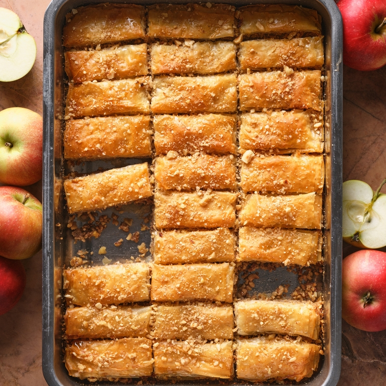 4. Smør en ildfast form som er ca 20x30 cm. Del filodeigplatene i to så de passer til bakebollen og du får 20 ark. Legg ett og ett ark filodeig i formen og pensle med det smeltede smøret. Pass på at resten av filodeigen er dekket med et fuktig håndkle så det ikke tørker ut. Fortsett å legge til filodeig og smøre hvert ark til du har 10 ark. Fordel halvparten av nøtteblandingen jevnt over filodeigen. Fordel så de revne eplene jevnt over nøttene og avslutt med resten av nøtteblandingen. Legg på de siste 10 filodeigsplatene med smør i mellom. Det siste laget bør også pensles med smør. Skjær baklavaen i firkanter og stek deretter midt i ovnen i ca 25–30 min.