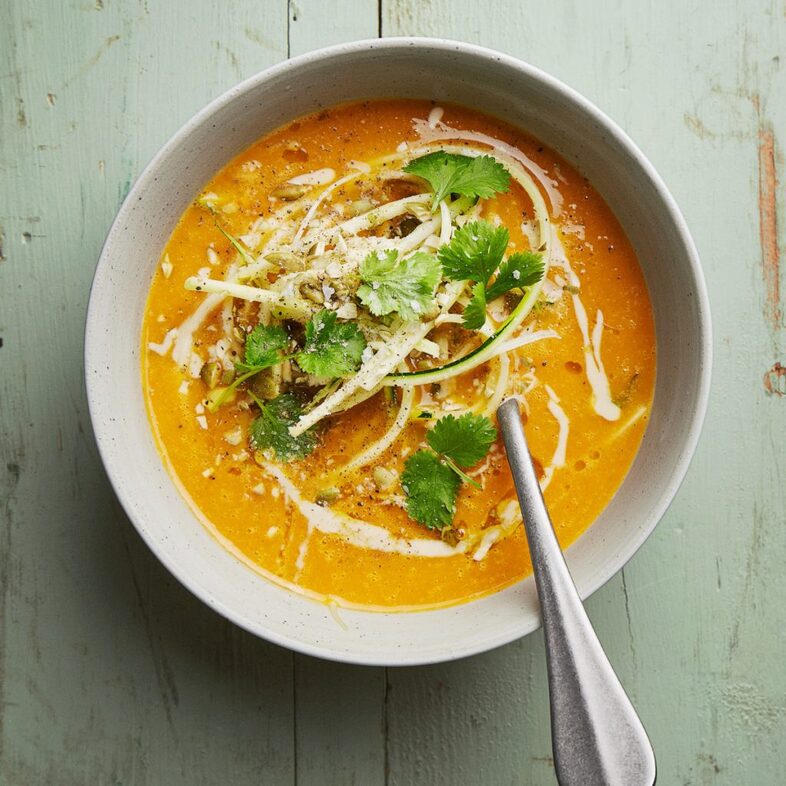 Hell suppen i boller og ringle over tahini, topp med zucchini, gresskarkjerner og koriander rett før servering.