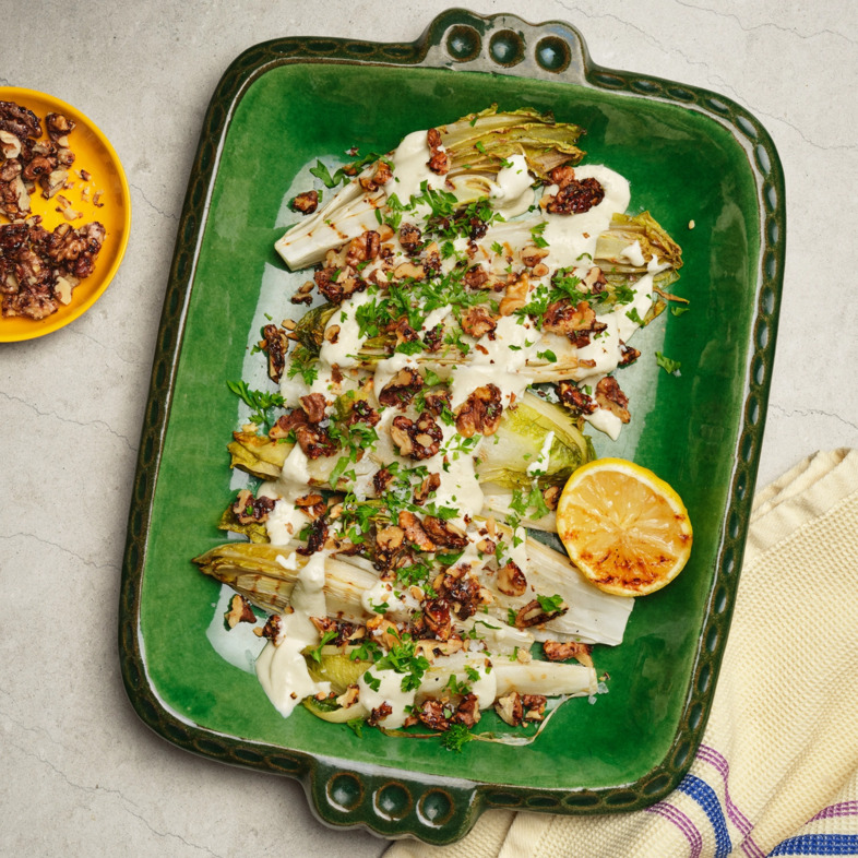 Grillet endiviesalat med tahini og parmesandressing og kandiserte valnøtter