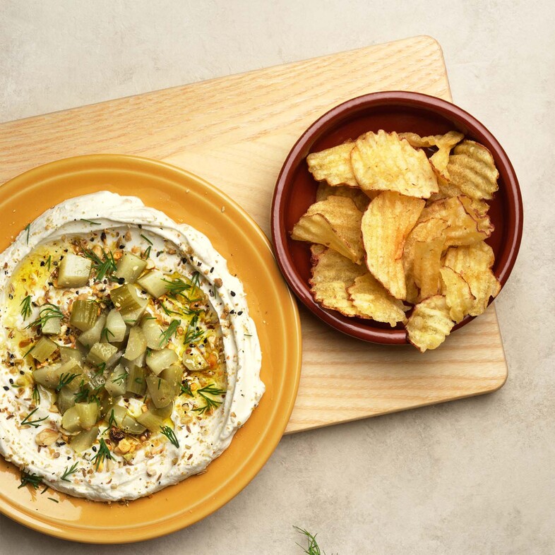3. Skjær libanesisk agurk i terninger. Fordel labnehn over en tallerken. Hell over en klatt olivenolje. Topp med agurk, dillkvister og flaksalt. Server med salt chips.