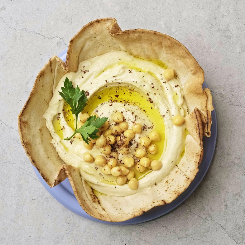 Serveringstips: Bryt av kanten på brødskålen og bruk den til å dyppe i hummusen – en spiselig skål som både er praktisk og smakfull!