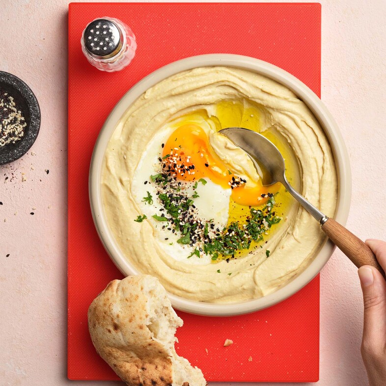 En enkel og smakfull rett som passer til alle tider på døgnet – hvor den silkemyke hummusen, det kremete egget og nøttesmaken fra sesamfrøene skaper en perfekt balanse. Serveres best med godt brød