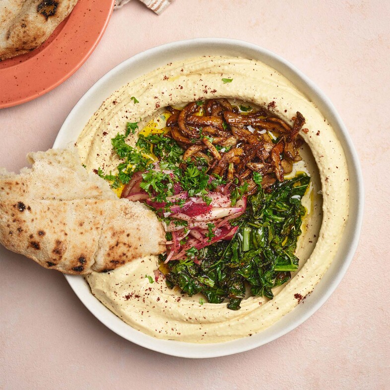 En inspirerende oppskrift som setter hummusen i sentrum og som kan varieres i det uendelige avhengig av årstid eller hva du har hjemme. Server på en mindre tallerken som tilbehør, eller en større til buffetbordet. Eller hvorfor ikke bytte ut svartkålen med din favorittgrønnsak, østersbåter med kylling og tilsett agurk i stedet for rødløk. Spises best sammen med godt brød
