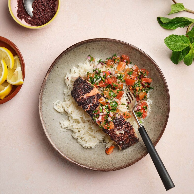 3. Sumaklaks: Bland sumak med olivenolje og salt i en liten bolle. Legg laksen i en ildfast form og fordel sumaoljen over laksen. Stek i ovnen til laksen har en innvendig temperatur på 52°c, ca 10 min.