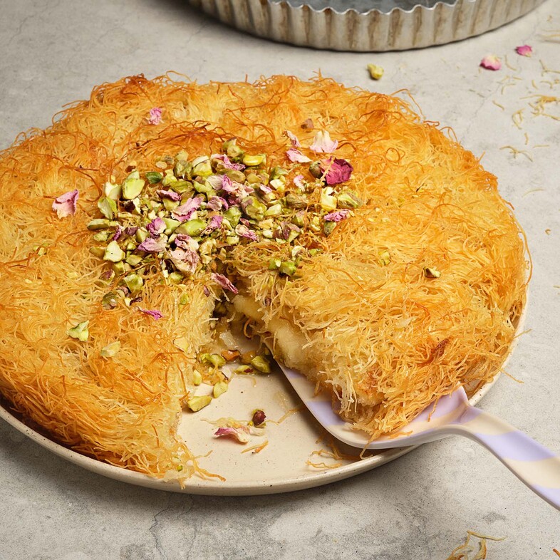 Künefe eller Kunafa er en populær tradisjonell Midtøsten-dessert laget med Kadaif-deig, strimlede spaghetti-lignende deigstrenger. Her fylt med herlig trevlet mozzarella og pyntet med pistasjnøtter.