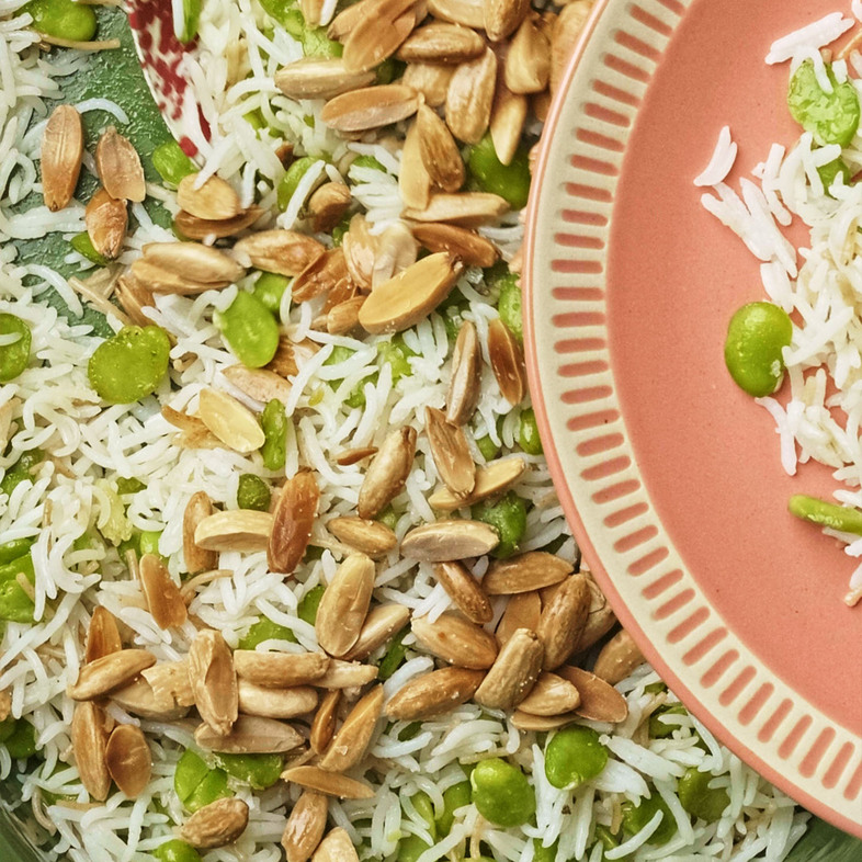 4. Bland ris og stekte bondebønner, legg over på fat og topp med de sprø mandlene.