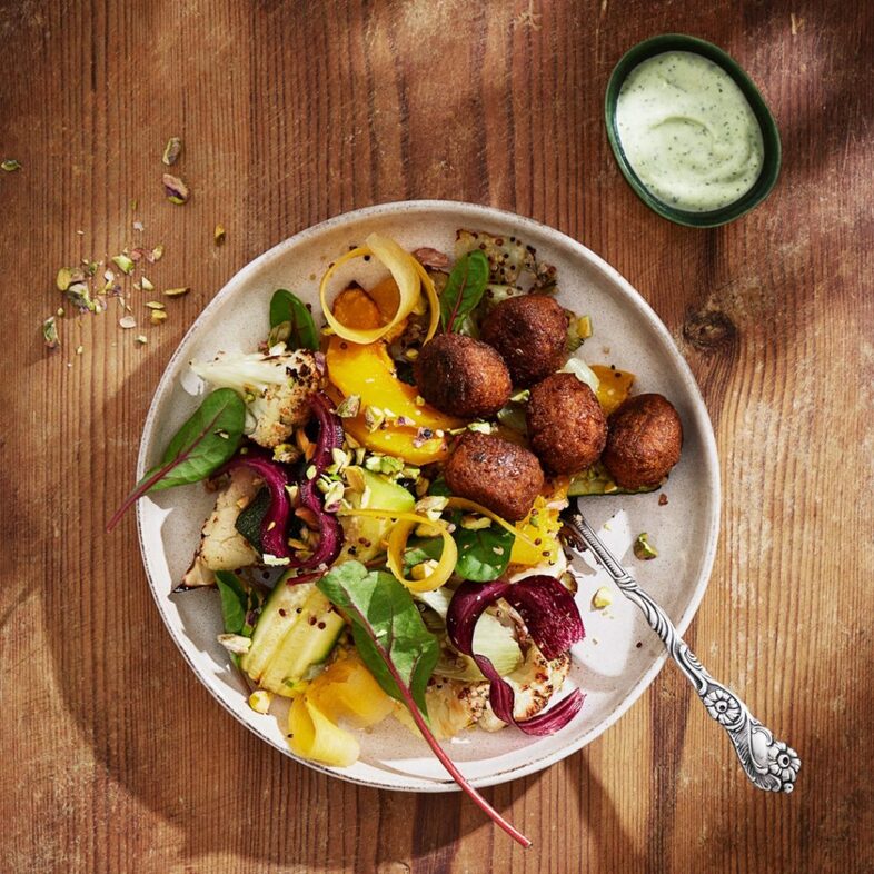 Lunken høstsalat med søtpotetfalafel og koriandermajones