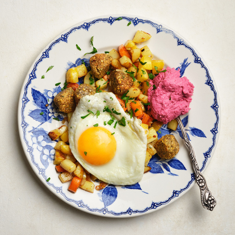4. Stek eggene og server med pyttipannen sammen med en klatt rødbethummus. Topp med litt hakket persille