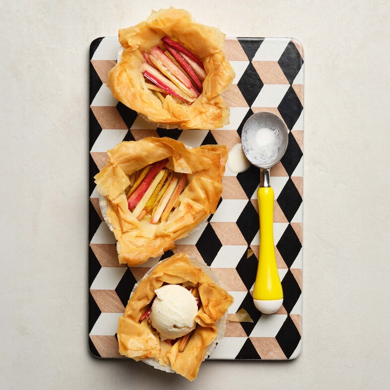 Har du mye rabarbra i hagen? Prøv denne varianten av rabarbrapai laget på filodeig i muffinsformer. Søtt, syrlig og crunchy på samme tid! Paien nytes best varm med en kule vaniljeis på toppen.