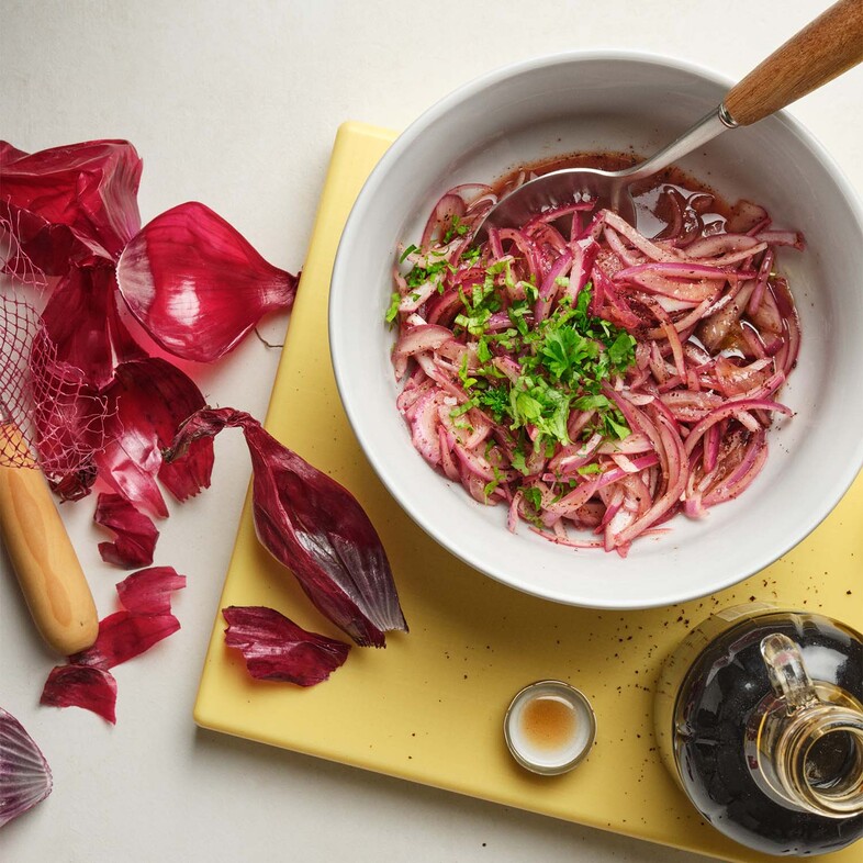 Her har vi syltet rødløk på Midtøsten-måten! Med ingredienser som sumak og granateplesirup blir det en ny smaksopplevelse. Rødløken passer på mezebordet og som tilbehør til det meste. Hvorfor ikke i en burger eller med taco? Oppskriften gir 4 porsjoner som tilbehør.