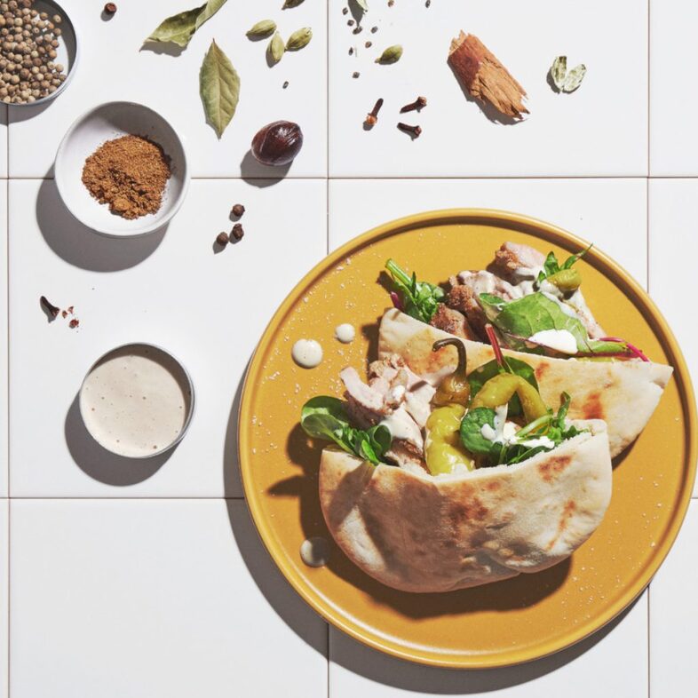 Kylling: Bland (tyrkisk/gresk) yoghurt, sitronsaft, olivenolje, revet hvitløk, shawarma kyllingkrydderblanding og salt til en marinade i en bolle. Legg kyllingen i marinaden og la den stå i kjøleskapet i minst 60 minutter.