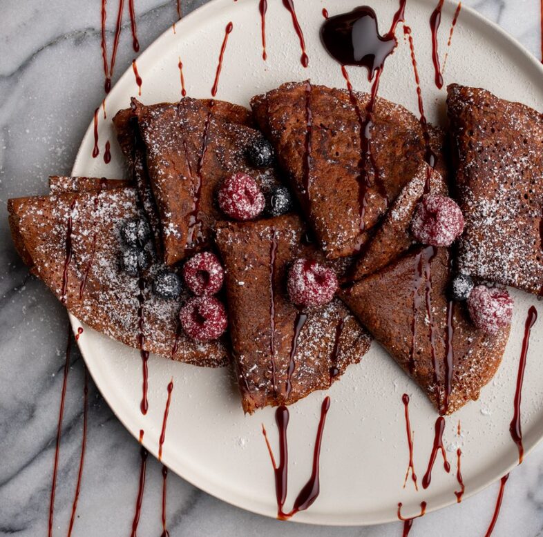 Server med daddelsirup og friske bær, og avslutt med å drysse med sukker.