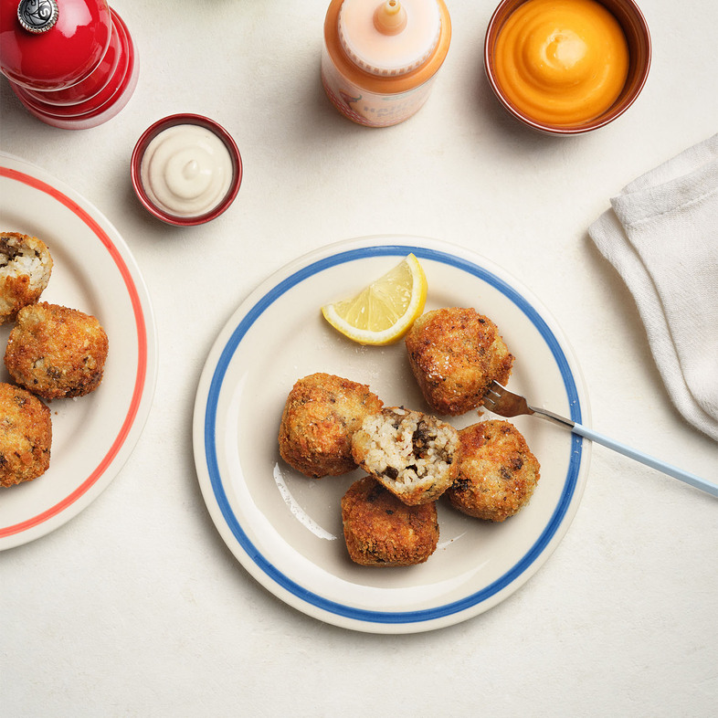 6. Varm rapsolje i en stor kjele eller traktorpanne til 160°C. Sørg for å ha et lokk for hånden. Stek risbollene, noen om gangen, til de er gyllenbrune og fjern med en hullsleiv. Server umiddelbart med harissa mayo eller tahinisaus.