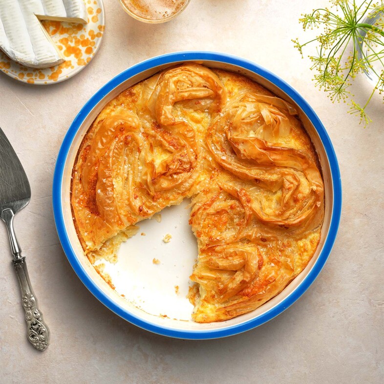 4. Hell eggeblandingen over filodeigen og stek paien midt i ovnen i 20–25 min eller til den er gyllenbrun. La avkjøle litt før servering.