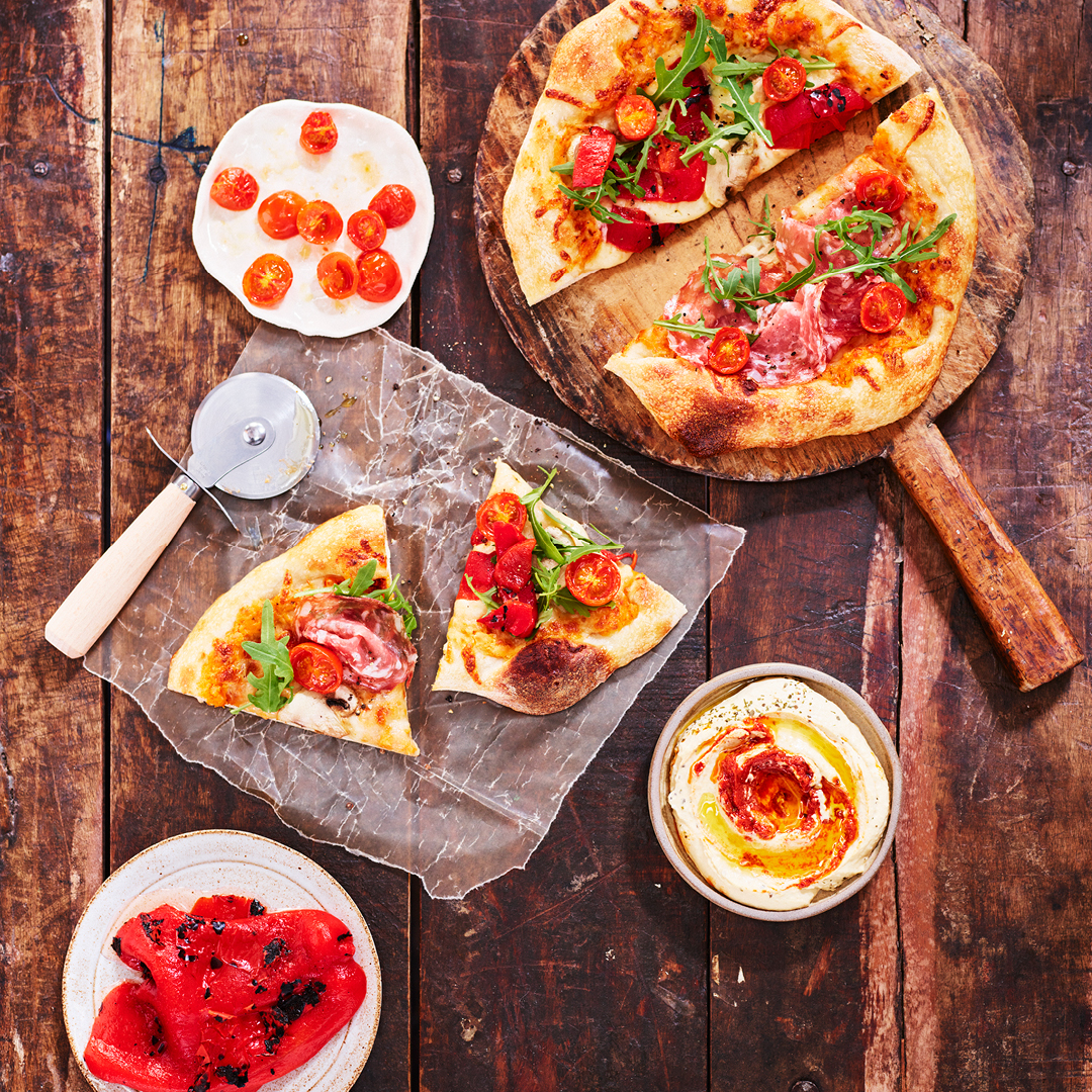 Kikerter (55%), vann, SESAM-pasta, rapsolje, soltørkede tomater (3%), tomatpuré, salt, solsikkeolje, surhetsregulerende middel (sitronsyre), basilika, hvitløkspulver, konserveringsmiddel (kaliumsorbat), sitron, krydder og urtekrydder.